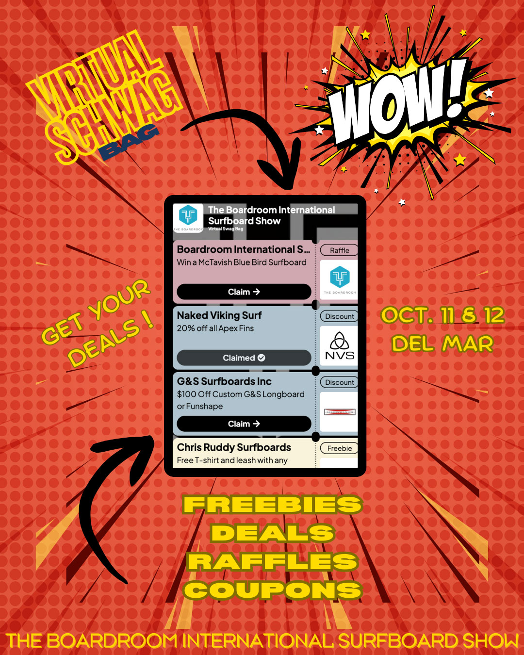 2pm | Virtual Schwag Bag Surfboard Giveaway – McTavish Blue Bird by Michael Arenal Booth A18 Merch Store Enter With Virtual Schwag Bag |